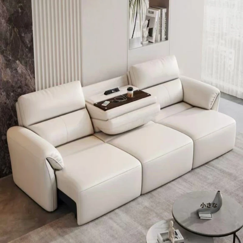 電動多機能本革リクライニングソファー 収納付き!スペースセーバー設計のカウチテーブル兼用、壁にぴったりフィットするコンパクトサイズ。狭い部屋でもスタイリッシュに!