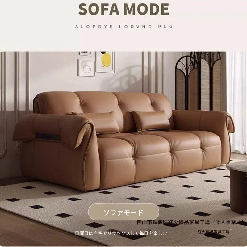 レトロ多機能ソファベッド 電動調整可能な本革 小型リビングに最適 中古真皮製 伸縮自在のスタイリッシュなソファで、快適な空間を演出!