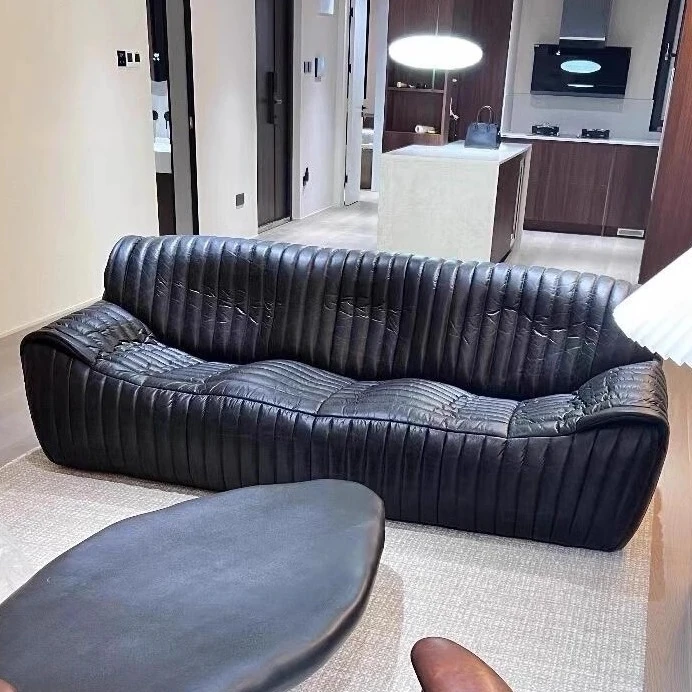 ポストモダンのシンプルでレトロなオイルワックスレザー全皮革ソファ|デザイナーが手掛けたイタリアンスタイルの3人掛けソファセットで、リビングに洗練された雰囲気をプラス!